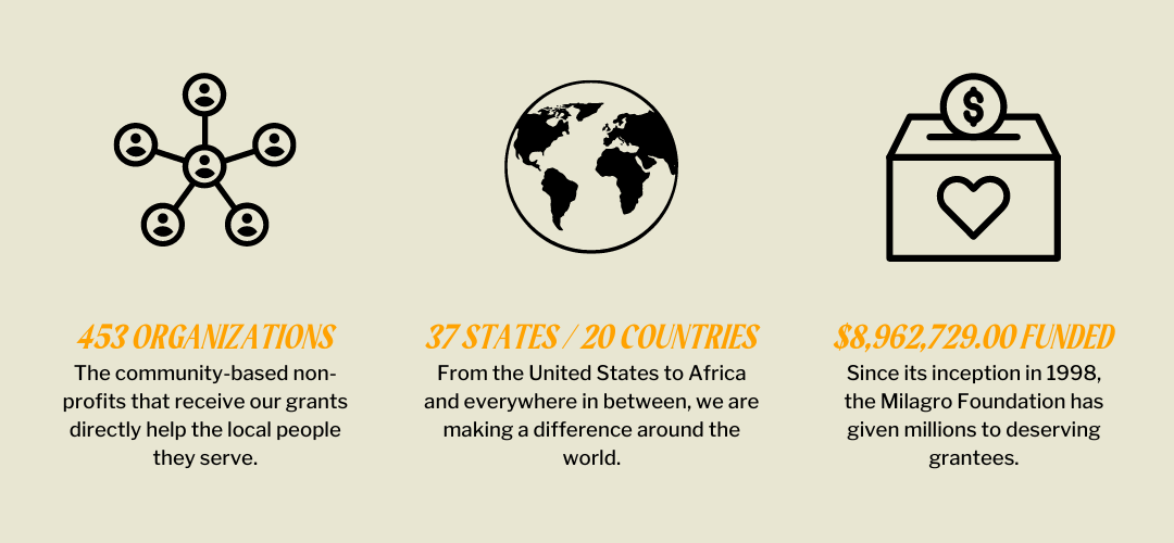 Milagro (“Miracle”) is a charitable foundation that supports underrepresented and vulnerable children and youth in the areas of arts, education and health. The Milagro Foundation was started in 1998 by Carlos Santana and his family to benefit children around the world. The Santana's realized they needed a foundation, a small staff and a Board of Directors to manage the number of personal requests for help they received on a daily basis. The foundation makes grants to organizations that work with children and youth, especially those at risk and disadvantaged due to such factors as poor health, illiteracy, or insufficient educational and cultural opportunities.